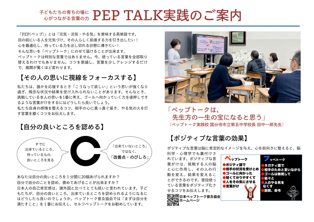 2学期初めには、改めて先生向け・保護者向け講演を行い、ペップトークの意識を高めています。