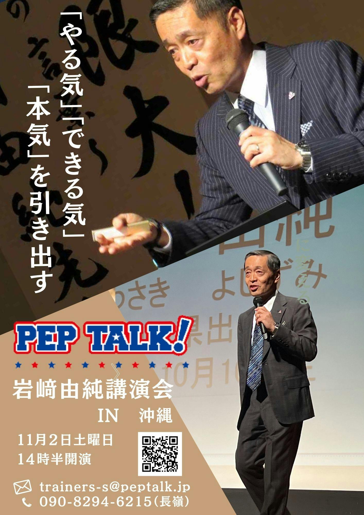 【岩﨑由純沖縄講演会】 日時:11月2日14時開演 場所:沖縄県西原町町民交流センター(さわふじ未来ホール) 費用:前売り2000円 当日2500円 小学生以下無料 お申し込み、詳細はこちらよりお願い致します 今後のセミナー予定 詳細およびお申込みはこちらよりお願い致します。 08/24(土)1.セルフペップ (徳島県徳島市)芝原佳子 08/24(土)1.セルフペップ (大阪府大阪市)藤江正直 桑野里美 08/25(日)2.ゴールペップ (大阪府大阪市)藤江正直 桑野里美 08/25(日)1.セルフペップ (オンライン)鈴木孝 08/26(月)1.セルフペップ (オンライン)増田美子 08/28(水)0.入門講座 (オンライン)関正彦 08/29(木)1.セルフペップ (オンライン)綱脇由美 08/30(金)2.ゴールペップ (オンライン)鈴木孝 08/31(土)0.入門講座 (オンライン)平井純子 08/31(土)1.セルフペップ(北海道北広島市)荒谷卓郎 08/31(土)1.セルフペップ (オンライン)松村聡也 09/01(日)2.ゴールペップ(北海道北広島市)荒谷卓郎 09/01(日)2.ゴールペップ(東京都国分寺市)小柳今日子 09/01(日)1.セルフペップ (岡山県岡山市)芝原佳子 09/01(日)0.入門講座 (オンライン)鈴木理恵 以降の予定はこちらをご確認ください。 STEP3以降のセミナー STEP3ビジョンペップトークセミナーがリニューアルされてこれまで2日間だった講座が1日で受講いただけます! 申し込み受付中 9/29(日)STEP3ビジョンペップ 大阪 講師 岩﨑由純 10/26(土)STEP3ビジョンペップ 東京/オンライン 講師 岩﨑由純 浦上大輔 11/17(日)STEP3ビジョンペップ 東京 講師 岩﨑由純 浦上大輔 2025年 1/11~13 STEP4スピーカー養成 関東 講師 岩﨑由純 浦上大輔 5/3~5 STEP4スピーカー養成 関東 講師 岩﨑由純 浦上大輔 ペップティーチャー講座 ※お申込みは、小学校~高校の教員、もしくはペップトーク講師の方に限らせて頂いております。