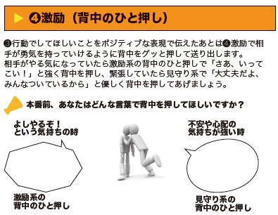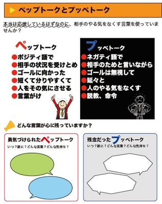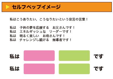 セルフペップトークセミナーはペップトークを習得するための最初の一歩です。普段自分が使っている言葉に気づき、ネガティブな言葉をポジティブに変換していきます。そして自分自身にポジティブな言葉がけを繰り返すことで前向きな心の状態を作ります。相手を励ます前にまずは自分を励ますことが重要です。励ます本人が前向きな心の状態だからこそ、言葉を通して相手にポジティブなエネルギーが伝わります。