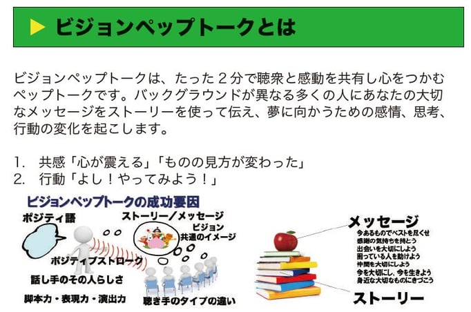 ビジョンペップトークは、ペップトークのメソッドを使い、短く・わかりやすく・相手の心に響くスピーチを実践するセミナーです。