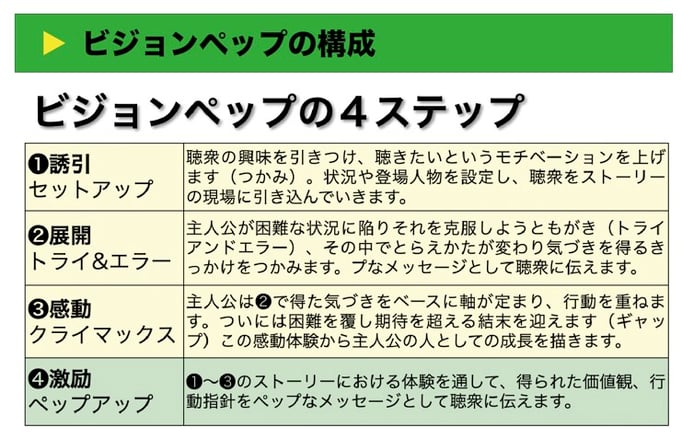 ●ストーリーを使って聴衆の心をつかむ感動のビジョンペップトークができるようになる。